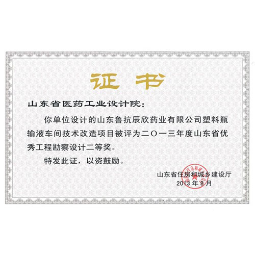 2013年度山東省優(yōu)秀工程勘察設(shè)計(jì)二等獎(jiǎng)