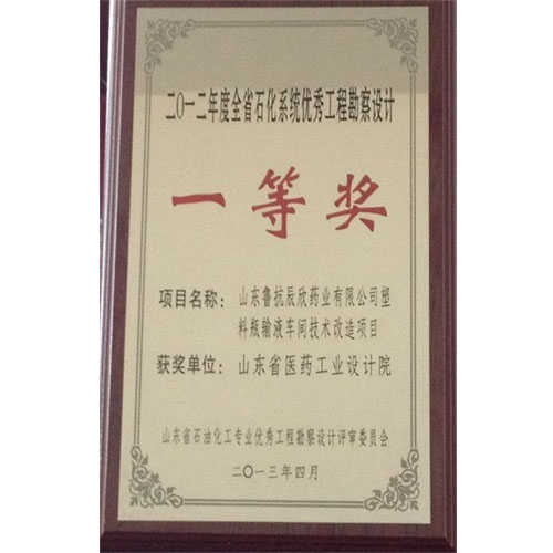 2012年度全省石化系統(tǒng)優(yōu)秀工程勘察設(shè)計(jì)一等獎(jiǎng)