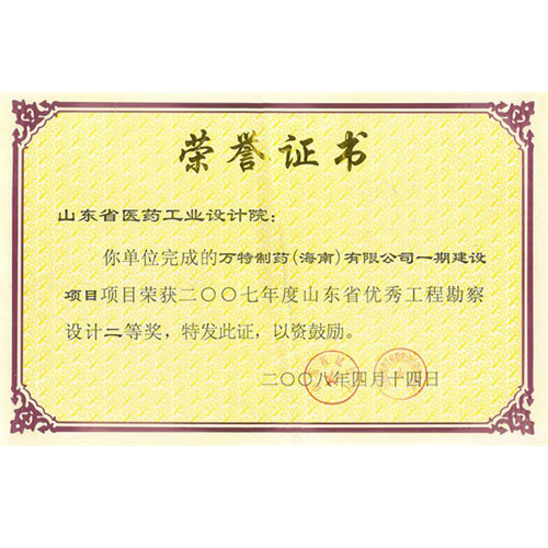 2007年度山東省優(yōu)秀工程勘察設(shè)計二等獎