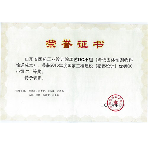 2016年度國家工程建設(shè)(勘察設(shè)計(jì))優(yōu)秀QC小組二等獎(jiǎng)