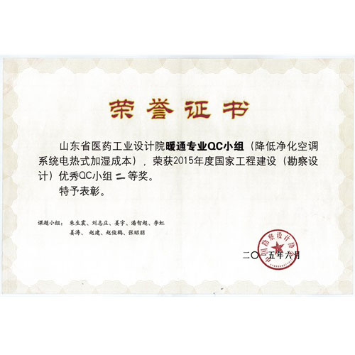 2015年度國家工程建設(shè)(勘察設(shè)計(jì))優(yōu)秀QC小組二等獎(jiǎng)