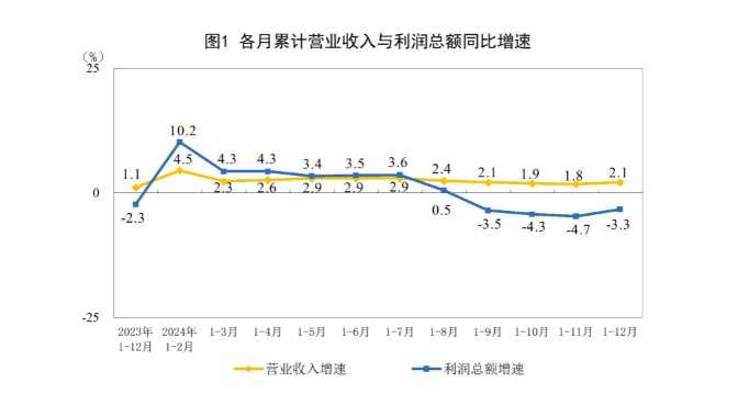 工業(yè)企業(yè)當月利潤由降轉(zhuǎn)增,四季度降幅明顯收窄,2024年12月份,全國規(guī)模以上工業(yè)企業(yè)利潤由11月份同比下降7.3%轉(zhuǎn)為增長11.0%;營業(yè)收入同比增長4.2%,較11月份加快3.7個百分點。在一攬子增量政策及時出臺后,四季度工業(yè)企業(yè)利潤穩(wěn)步恢復,降幅較三季度大幅收窄12.7個百分點。從全年看,2024年,規(guī)模以上工業(yè)企業(yè)營業(yè)收入較上年增長2.1%,實現(xiàn)利潤總額74310.5億元,較上年下降3.3%。