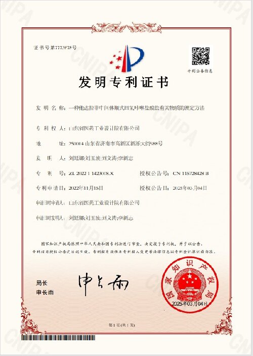 近日,山東省醫(yī)工院自主研發(fā)的“一種他達(dá)拉非中間體順式四氫咔啉鹽酸鹽有關(guān)物質(zhì)的測(cè)定方法”獲國(guó)家知識(shí)產(chǎn)權(quán)局發(fā)明專(zhuān)利授權(quán)。