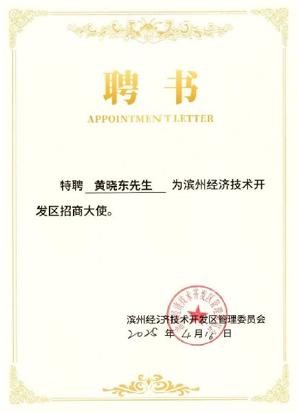 4月16日,濱州經(jīng)濟(jì)技術(shù)開發(fā)區(qū)管理委員會(huì)舉行“招商大使”授聘儀式,山東省醫(yī)工院黨總支書記、董事、總經(jīng)理黃曉東被聘為濱州經(jīng)濟(jì)技術(shù)開發(fā)區(qū)招商大使,獲頒聘書。