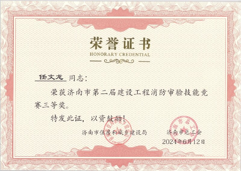 7月12日,由濟南市住房和城鄉(xiāng)建設局、濟南市總工會主辦的濟南市第二屆建設工程消防審驗技能競賽舉行了頒獎儀式,省醫(yī)工院員工任文龍榮獲競賽個人三等獎。