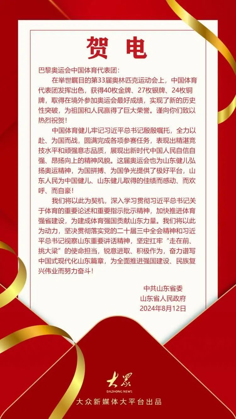 8月12日,山東省委、省政府向巴黎奧運(yùn)會(huì)中國(guó)體育代表團(tuán)致賀電。