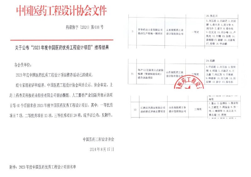 8月17日,中國醫(yī)藥工程設(shè)計(jì)協(xié)會(huì)公布了“2023年度中國醫(yī)藥優(yōu)秀工程設(shè)計(jì)項(xiàng)目”評(píng)選結(jié)果,省醫(yī)工院設(shè)計(jì)的甘李藥業(yè)山東有限公司臨沂生產(chǎn)基地一期項(xiàng)目等3個(gè)項(xiàng)目榮獲2023年度中國醫(yī)藥優(yōu)秀工程設(shè)計(jì)項(xiàng)目,其中一等獎(jiǎng)1項(xiàng),三等獎(jiǎng)2項(xiàng)。