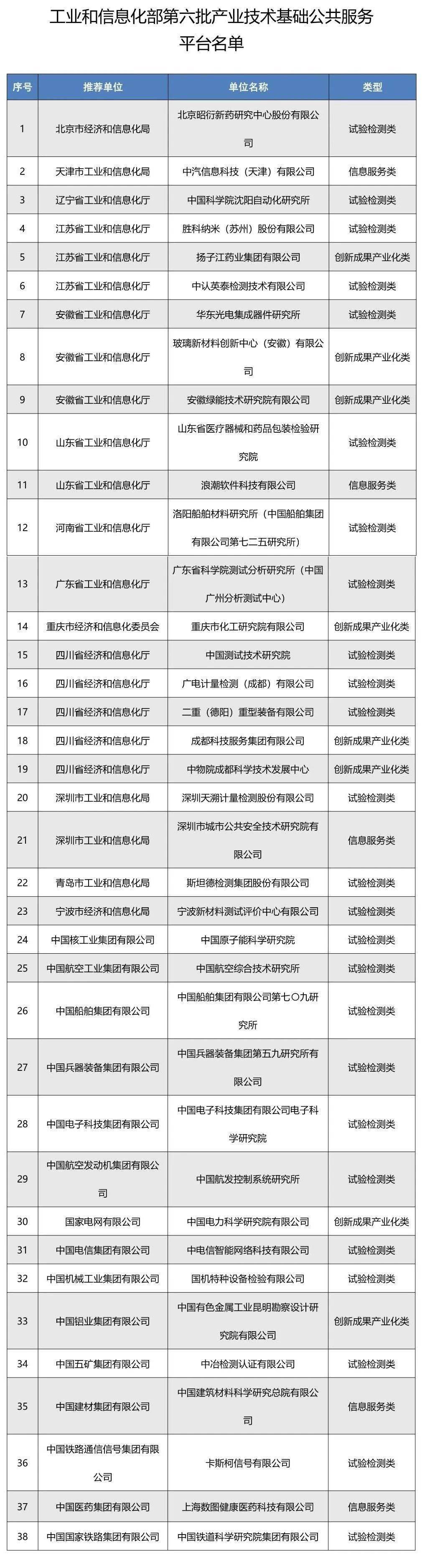 為進一步加強行業(yè)共性技術平臺建設,提升產業(yè)技術基礎公共服務能力和水平,根據(jù)《工業(yè)和信息化部辦公廳關于做好第六批產業(yè)技術基礎公共服務平臺申報工作的通知》(工信廳科函〔2024〕378號)要求,經評審和公示,確定北京昭衍新藥研究中心股份有限公司等38家單位為工業(yè)和信息化部第六批產業(yè)技術基礎公共服務平臺(見附件),現(xiàn)予以公布。