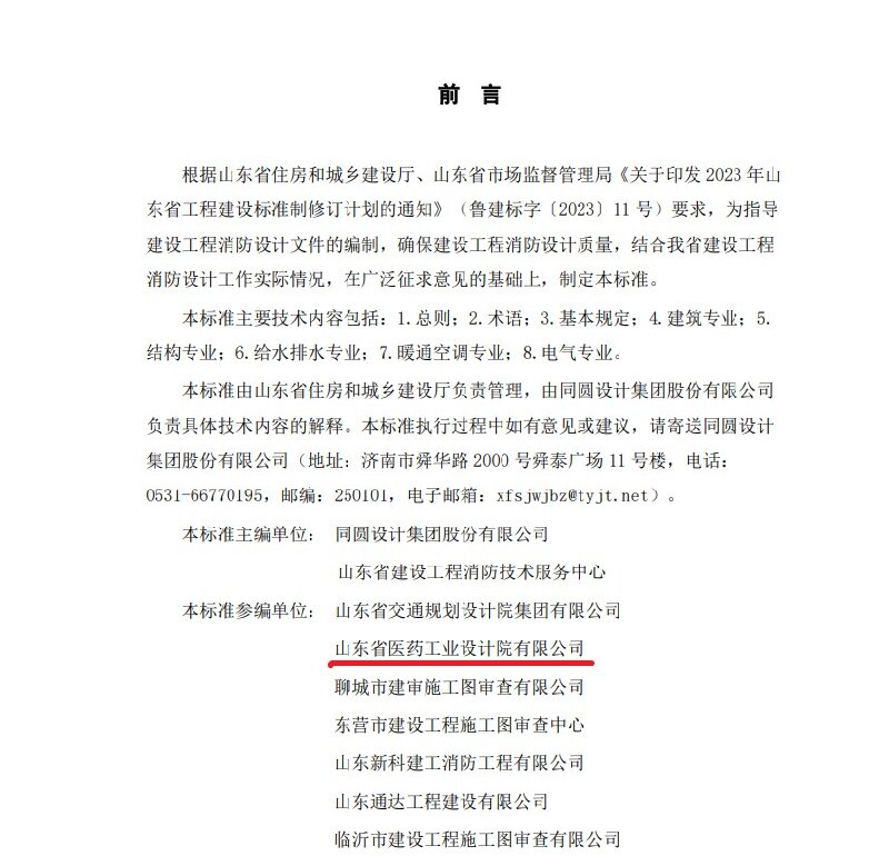 山東省醫(yī)工院作為國內(nèi)最資深和全面的醫(yī)藥工程專業(yè)服務商之一,深度參與了這一重要標準的起草與修訂工作,為構建建設工程的標準化藍圖貢獻了智慧與力量。作為參編單位,山東省醫(yī)工院在標準制定的過程中,多次參與線上線下討論,及時提供相關技術信息,確保標準能夠緊密貼合行業(yè)需求,積極指導企業(yè)提高建設工程消防設計文件編制質(zhì)量。