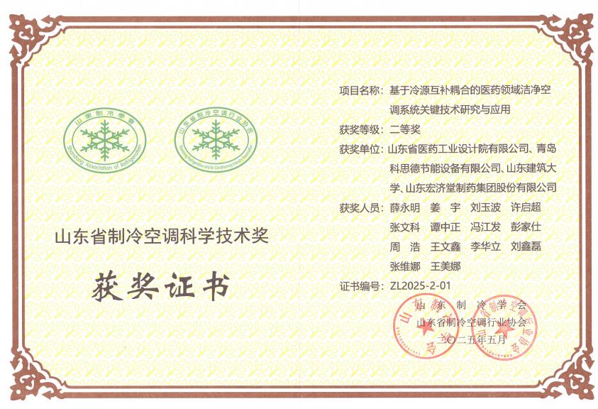 5月24日,山東制冷學會、山東省制冷空調行業(yè)協(xié)會公布“山東省制冷空調科學技術獎”評選結果,山東省醫(yī)工院《基于冷源互補耦合的醫(yī)藥領域潔凈空調系統(tǒng)關鍵技術研究與應用》項目,榮獲山東省制冷空調科學技術獎二等獎。