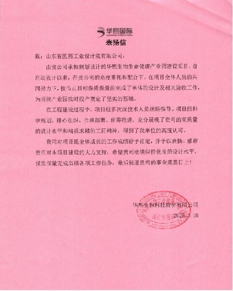 近日,山東省醫(yī)工院收到華熙生物科技股份有限公司贈送的錦旗和表揚信,對項目團隊高質(zhì)高效的設計服務和精益求精的工匠精神表達誠摯謝意。