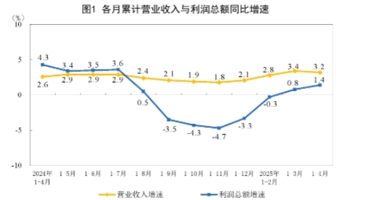 國家統(tǒng)計(jì)局5月發(fā)布了2025年1—4月份全國固定資產(chǎn)投資及規(guī)模以上工業(yè)企業(yè)利潤情況,據(jù)國家統(tǒng)計(jì)局投資司首席統(tǒng)計(jì)師羅毅飛與工業(yè)司統(tǒng)計(jì)師于衛(wèi)寧介紹,1—4月份,全國固定資產(chǎn)投資(不含農(nóng)戶)147024億元,同比增長4.0%,保持穩(wěn)定增長;1-4月份規(guī)模以上工業(yè)企業(yè)營業(yè)收入保持增長,實(shí)現(xiàn)利潤總額21170.2億元,同比增長1.4%(按可比口徑計(jì)算)。